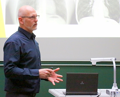 Chefarzt Dr. med. Mathias Grohmann bei seinem Vortrag am Veit-Höser-Gymnasium Bogen, im Hintergrund: Röntgenbilder von der Lunge. – Foto: Klinik Bogen