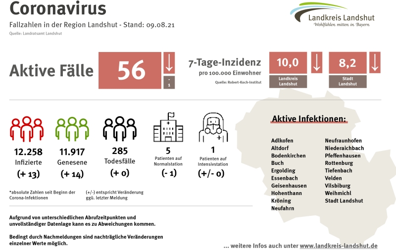 Das Robert-Koch-Institut weist für die Stadt Landshut heute eine 7-Tage-Inzidenz von 8,2 aus, im Landkreis wird dieser Wert mit 10,0 beziffert. Beide Werte sind seit Freitag insgesamt gesunken, auch wenn sie am Samstag noch einmal niedriger lagen.