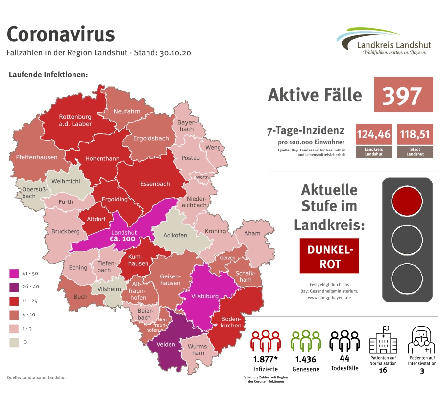Die Betroffenen kommen aus der Stadt Landshut und verteilt über den Landkreis Landshut (nur in den Gemeinden Adlkofen, Obersüßbach, Weihmichl und Vilsheim sind derzeit keine laufenden Infektionen labortechnisch nachgewiesen). Eine Person (zirka 80 Jahre), die mit Corona infiziert war, ist nach einem Krankenhausaufenthalt verstorben. Damit sind 44 Personen verstorben, bei denen ein Zusammenhang mit einer Corona-Infektion möglich ist. In den Krankenhäusern in der Region werden 16 Covid-Patienten auf den Normalstationen isoliert, drei intensivmedizinisch betreut. (Stand 30. Oktober 2020).