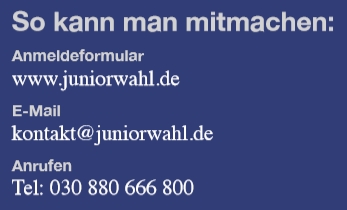 Bei der Juniorwahl geht es darum, dass im Rahmen einer realistische Simulation, bei der Schüler erste eigene Erfahrungen mit demokratischen Wahlen machen können – auch, wenn sie noch keine 18 Jahre alt sind. Und das funktioniert so: Mit den Lehrkräften werden die Schüler im Unterricht über die Themen „Wahlen“ und „Demokratie“ sprechen. Die Schule erhält dafür umfangreiches Unterrichtsmaterial und Weiterbildungsangebote. Dann sind die Schüler an der Reihe: Sie legen ein Wählerverzeichnisse an, verteilen Wahlbenachrichtigungen, richten ein Wahllokal ein und bilden Wahlvorstände. All das ist wichtig, damit eine Wahl auch wirklich fair abläuft und niemand z.B. seine Stimme zweimal abgeben kann. Das Juniorwahl-Projekt gibt dazu umfangreiche Hilfestellungen.