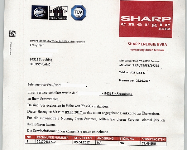 Ein Kunde hat sich bei den Stadtwerken gemeldet, der eine Rechnung (siehe Foto) von einer dubiosen Firma erhalten hat. Angeblich wäre ein Servicetechniker am Stromzähler gewesen. Was er daran getan hätte, erschließt sich allerdings nicht. Für die Servicepauschale ist ein Überweisungsträger beigelegt.
