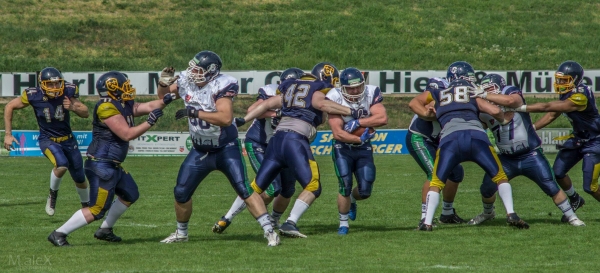 Obwohl das am Ende auch der Halbzeitstand war, sahen die Zuschauer im Europaviertel eine rassige und spannende Partie, in der beide Mannschaften um jeden Yard gekämpft haben, wobei gerade die Defense der Spiders das Spiel besser unter Kontrolle bekam und die Offense der Wiesbadener früh stoppen konnte. Leider hatte die Offense ähnliche Probleme, wie in Albershausen, als man zwar großartige Drives hinlegte, sich dann aber selbst immer wieder das Leben schwer machte. So geschehen vor der Pause – Mark Wright führt die Offense an die gegnerische 5-Yard-Linie, als eine völlig unnötige Strafe das Team 15 Meter Strafe kostet, weshalb man ein Field Goal versuchte, welches jedoch geblockt wurde.