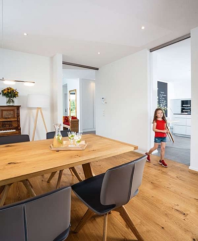 Der Baustoff Holz hat den Vorteil, dass er Wasserdampf aus feuchter Luft aufnimmt und ihn bei Trockenheit wieder abgibt. Das sorgt für ein gesundes Raumklima. Die modernen Neubauten in Fertigbauweise haben zudem sehr gute Dämmeigenschaften, was der Energieeffizienz zugutekommt – allerdings auch den Luftaustausch reduziert. Daher sind die Häuser mit einer intelligenten Be- und Entlüftungsanlage ausgestattet. Diese transportiert Luftschadstoffe aus dem Rauminneren nach außen, reinigt die einströmende Luft über ein Filtersystem und schafft so ein optimales und ausgeglichenes Raumklima. Allergiker können einen zusätzlichen Pollenfilter in die Lüftungsanlage einbauen. Weitere Informationen rund um das Thema Wohngesundheit gibt es unter www.weberhaus.de/wohngesundheit.