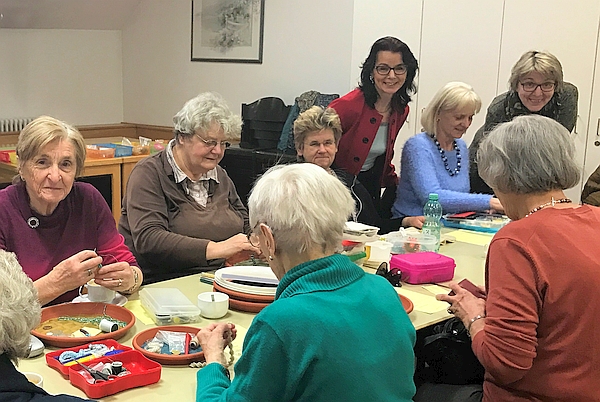 Die Teilnehmerinnen der Bastelgruppen waren gerade eifrig dabei, Schmuck aus Perlen herzustellen. König war sehr überrascht, als sie sah, dass die Frauen im Alter zwischen 70 und 90 Jahren – zum Teil mit Sehhilfen und anderen medizinischen Hilfsgeräten ausgestattet – sich auch nicht vor den kleinsten Perlen scheuten und wunderschönen Perlenschmuck zauberten. Cornelia Czichon, die diesen Kurs leitet, betonte: „Die Seniorinnen können oft viel mehr, man muss es ihnen einfach zutrauen und vor allem das gemeinsame Basteln macht den Frauen viel Spaß.“
