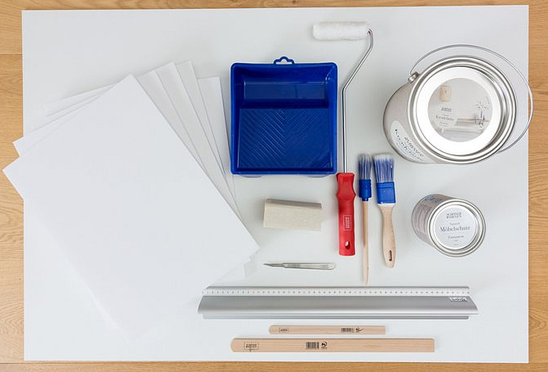 Der neue Hingucker für die heimischen Wände beginnt mit einer guten Planung. Wie will man das Reliefbild gestalten? Geometrische Formen lassen sich auf dem Untergrund vielfältig anordnen und kombinieren. Eine Skizze hilft dabei, die spätere Optik des fertigen Kunststücks festzulegen. Danach geht es ans Einkaufen: Neben einer HDF-Platte in Weiß benötigen die Hobbykünstler die Schöner Wohnen Naturell Kreidefarbe zum Anstreichen sowie den Möbelschutz zur Oberflächenbeschichtung. Zusätzlich stehen auf der Einkaufsliste Kappa Fix Leichtstoffplatten für die Reliefteile, ein Cuttermesser, Metalllineal, Farbrolle, Pinsel und Farbwanne für den Anstrich sowie etwas Schleifpapier.