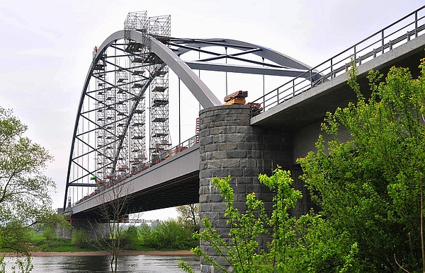 [the_ad id=“3948″]In der nun laufenden dritten Bauphase wird der andere Bogen für die erforderliche Verstärkung eingerüstet. Gleichzeitig werden die zusätzlich angebrachten Verstärkungsbleche an den Längsträgern an der Unterseite des Überbaus verschweißt. Dabei besteht derzeit auf dem Bauwerk durch die beiden Gerüste eine hohe zusätzliche Grundbelastung.