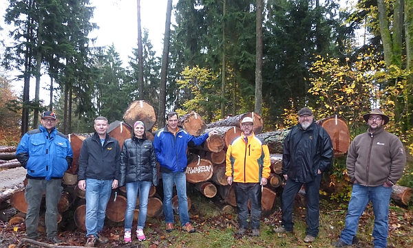 Bei der Holzübername mit dabei: (von links:) Michael Blabmeier; Dipl.-Ing. Alexander Diewald, Seeberger Friedl Planungsgesellschaft mbH; Dipl.-Ing. (FH) Mirjam Mandl-Rödler M.Sc., TFZ Straubing; Dipl.-Ing. (FH) Frank Grottenmüller, Grossmann Bau GmbH & Co. KG; Forstbetriebsleiter Jürgen Völkl, Forstbetrieb Bodenmais; Tom Bauer, Bauleitung Dömges AG, und Joachim Riedl, Fa. Schmid GmbH.