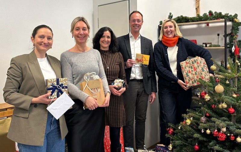 Von links: Kommunikationsleiterin Carolin Seidel, Personalleiterin Anna Sponsel, stellvertretende Betriebsratsvorsitzende Tamara Krah und Standortleiter Thomas Thym überreichen Geschenke für die Kinder des Caritas-Kinderheims Landshut an Leiterin Magdalena Dauer