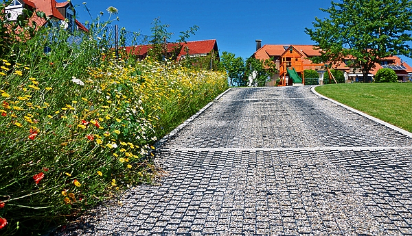 Die Waben dämmen Kiesbewegungen ein und verhindern so eine Rillenbildung. Durch den Einsatz der Platten kommt es nicht zu einer Versiegelung, denn Niederschläge laufen durch die siebartige Struktur der Kammern ab. So werden Pfützenbildung und unnötige Kosten vermieden. Da das Wasser einfach im Boden versickert und keine Vollversiegelung der Fläche besteht, kann die Ableitung von Niederschlag so nicht von den Kommunen gesondert in Rechnung gestellt werden. Die handliche und leichte Platte erlaubt eine schnelle Arbeitsweise – auch ohne schweres Gerät, denn durch ein Klick-Verbindungssystem ist sie auch für Heimwerker leicht im Verbund verlegbar.