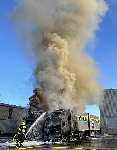 Zahlreiche Einsatzkräfte von Feuerwehr und Rettungsdienst rückten gegen 11.45 Uhr in den Straubinger Osten aus. Hinter dem Logistik-Center von Edeka stiegen die dunklen Rauchwolken in die Höhe. Dort brannten die Fahrerkabinen zweier nebeneinander geparkter Lkw. Wie ein Polizeisprecher erklärte, seien beide Fahrzeuge vor kurzem aus dem Verkehr genommen und bereits abgemeldet worden. Deshalb liege der Schaden höchstwahrscheinlich „nur“ bei 40.000 Euro.