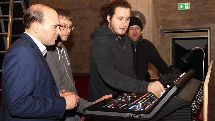 Die Rocket-Club-Betreiber Thomas Widmair (Zweiter von links) und Oliver Rösch (rechts) zeigen dem Bundestagsabgeordneten Florian Oßner (links) gemeinsam mit Tontechniker Florian Schmid das digitale Mischpult, das der Bund gefördert hat. – Foto: Bragulla