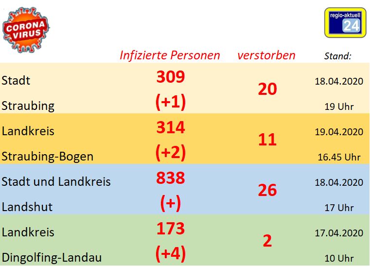 (pw) In den vergangenen 24 Stunden gab es im Stadtgebiet Straubing 309 bisher bestätigte Infektionen mit dem Corona-Virus, im Landkreis Straubing-Bogen kamen zwei (Vortag: neun) neue Infizierungen mit dem neuartigen Corona-Virus hinzu. Insgesamt gibt es damit im Landkreis seit Ausbruch der Pandemie 314 Infizierte (Stand 19. April um 16.45 Uhr).