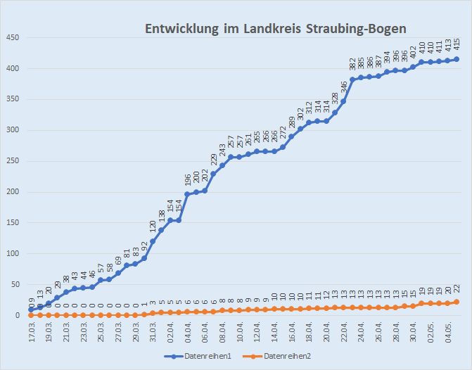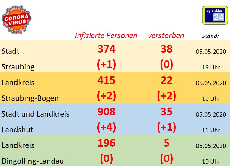 Über Todesfälle berichten der Landkreis Straubing-Bogen (2, jetzt 22) und der Landkreis Landshut (1, jetzt 35). – Details siehe Tabelle!