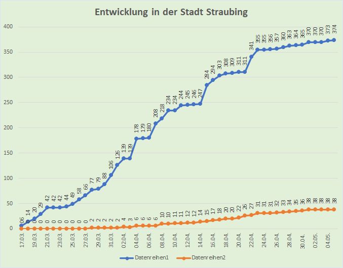 (pw) Das Straubinger Rathaus meldete am Dienstagabend eine neue Infektion mit dem Corona-Virus, das Landratsamt Straubing-Bogen zwei neue Fälle. Damit haben sich bislang in der Stadt insgesamt 374 Personen infiziert, im Landkreis Straubing-Bogen 415. Im Nachbarlandkreis Landshut (inklusive Stadt) stieg die Zahl der Infizierten auf 908 (plus 4).