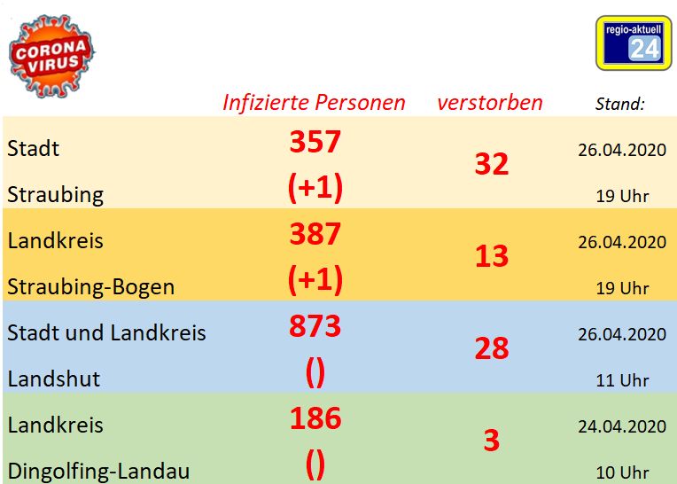 (pw) Wie bereits am Samstag hat sich in der Stadt Straubing und im Landkreis Straubing-Bogen auch am Sonntag die Zahl der bestätigten Covid-19-Infektionen nur gering vergrößert. Das Straubinger Rathaus meldete am Sonntagabend 357 (+1) infizierte Personen, das Landratsamt 387 (+1). In Straubing wurde eine verstorbene Person registriert, die mit dem Covid-19 angsteckt war.
