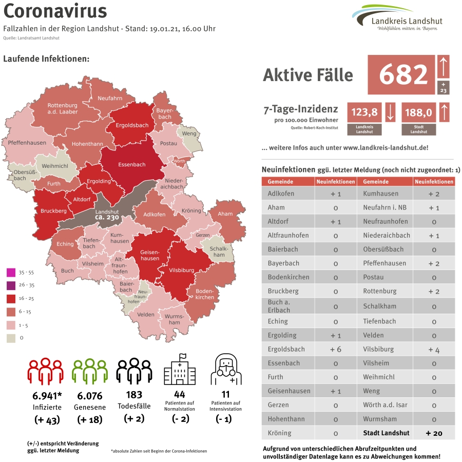(ra) In der Region Landshut sind am Dienstag zwei weitere Todesfälle im Zusammenhang mit der Corona-Pandemie gemeldet worden. Die Zahl der Todesfälle ist damit auf 183 angestiegen: Eine 79-jährige Person ist an den Folgen von Covid-19 verstorben, eine 82-jährige Person wurde zwar positiv auf das Virus getestet, es war aber eine andere Ursache für das Ablebend ausschlaggebend. Auf den Normalstationen der regionalen Krankenhäuser werden derzeit 44 mit dem Corona-Virus infizierte Patienten isoliert (-2), elf weitere müssen intensivmedizinisch behandelt werden (-1).