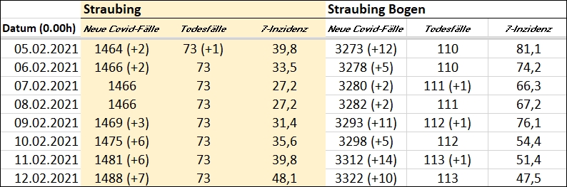 (ra) Laut Robert-Koch-Institut wurden am Donnerstag in Straubing sieben weitere Personen, die mit dem SARS-CoV-2 infiziert sind, registriert. Damit stieg der 7-Tage-Inzidenzwert auf 48,1 an. Im Landkreis Straubing-Bogen wurden zehn Neuinfizierte gemeldet. Hier liegt der 7-Tage-Inzidenzwert bei 47,5.