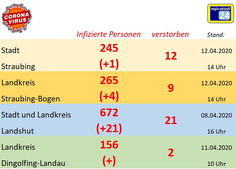 Im Klinikum Straubing befinden sich (Stand: 12. April um 10 Uhr) 18 Patienten mit Corona-Infektion in Behandlung, davon drei auf der Intensivstation. In den Landkreis-Krankenhäusern befinden sich derzeit 67 Covid-19-Patienten in stationärer Behandlung, 18 davon intensiv-medizinisch (Stand: 12. April um 9 Uhr).