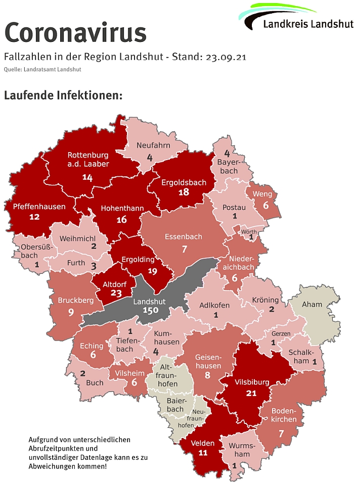 Es wurde dem Staatlichen Gesundheitsamt ein weiterer Todesfall gemeldet – eine 92-jährige ist in Zusammenhang mit Covid-19 verstorben. Somit steigt die Zahl der Todesfälle auf 288. Bedingt durch das hohe Infektionsgeschehen bewegen sich auch die 7-Tages-Inzidenzen unverändert hohem Niveau: Im Landkreis weist das Robert-Koch-Institut einen Wert von 83,8 aus (leichter Anstieg seit Mittwoch), in der Stadt Landshut wird die Inzidenz (Stand: Freitag um 0 Uhr) mit 106,8 ausgewiesen, was einen Rückgang im Vergleich zur Wochenmitte bedeutet.