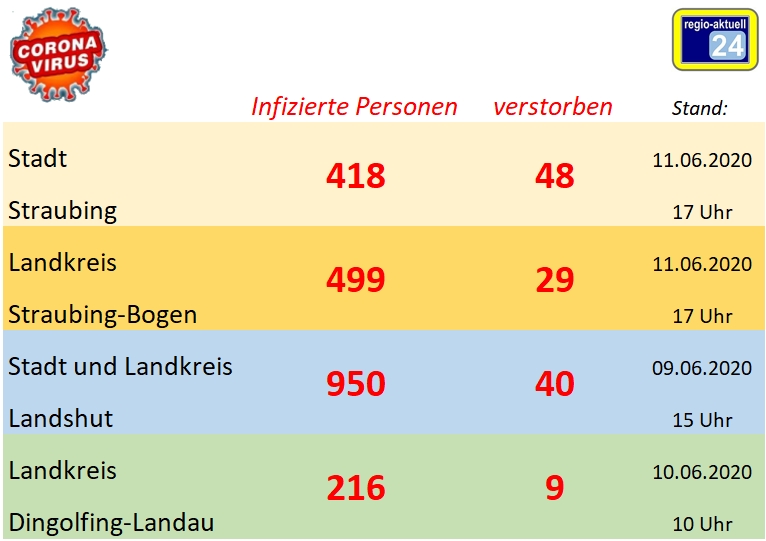 Zahlen zu den Genesenen können erst am späten Freitagnachmittag aus dem Rathaus geliefert werden. Im Klinikum Straubing befinden sich (Stand 11. Juni um 8.30 Uhr) drei Patienten mit bestätigter oder Verdacht auf Corona-Infektion in Behandlung. Alle drei werden auf der Normalstation behandelt. Sieben Covid-19-Patienten werden stationär Behandlung in den Landkreis-Krankenhäusern behandelt, keiner davon intensiv-medizinisch (Stand 10. Juni um 9 Uhr).