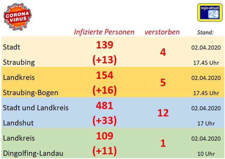 (jh) Die Stadt Straubing meldete am frühen Donnerstagabend, dass zwei weitere Personen im Klinikum St. Elisabeth verstarben, die mit dem Covid-19 infiziert waren. Dabei handelt es sich um einen 79-jährigen Mann und eine 84-jährige Frau. Beide hatte Vorerkrankungen. Die Zahl der Todesfälle in der Stadt liegt jetzt bei vier. In der Stadt und im Landkreis sind gegenwärtig 293 Personen als infiziert registriert.