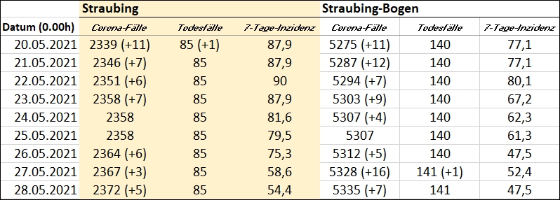 (ra) Nach sieben neu gemeldeten positiven Tests auf SARS-CoV-2 am Donnerstag liegt die 7-Tage-Inzidenz im Landkreis Straubing-Bogen bei 47,5 (RKI, Stand Freitag, 0 Uhr). In der Stadt Straubing wurden fünf neue Fälle registriert. Hier liegt die Inzidenz bei 54,4. Erleichterungen gibt es erst bei fünf Tag ohne Unterbrechung unter dem Wert 50. In den Landkreis-Kliniken befinden sich drei Personen aufgrund einer Covid-19-Erkrankung in Behandlung auf den Intensivstationen.