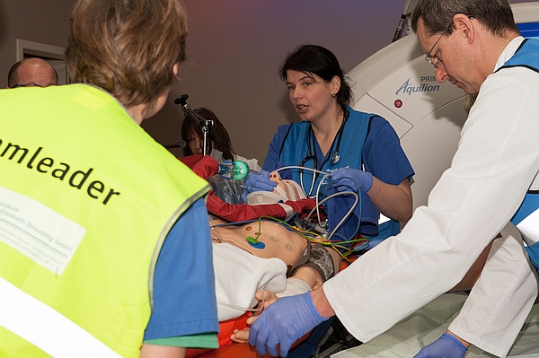 Teilnehmer des Schockraumteams mit der Simulationspuppe im Computertomographieraum – Foto: Eisenmann