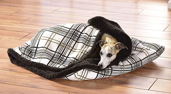Ein Hund braucht nicht in jedem Raum ein spezielles Bett. Wer zum Beispiel in der Küche oder im Arbeitszimmer einfach nur eine Decke anbieten möchte, sollte darauf achten, dass sie sowohl vor der Kälte unbeheizter Fliesen als auch vor zu viel Wärme einer Fußbodenheizung schützt. Das ist zum Beispiel der Fall, wenn eine Seite aus kühlendem Baumwollstoff und die andere aus wärmendem Berberfleece besteht. Je nach Situation wird die Decke einfach umgedreht – fertig ist der einfache, aber in jedem Raum einsetzbare Kuschelplatz für den Hund.