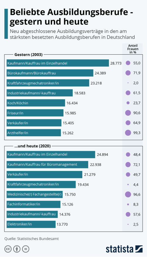 So liegt die Ausbildung zum bzw. zur Verkäufer/in heute auf Platz drei (21.279 neu abgeschlossene Ausbildungsverträge) – 2003 reichte es mit rund 15.000 neuen Verträgen nur für Platz sieben. Neu hinzugekommen in der Top-8-Liste sind die Ausbildungen zum bzw. zur Fachinformatiker/in und Elektroniker/in. Koch/Köchin ist in der Beliebtheit gesunken und hat es nicht mehr in die Grafik geschafft und auch nicht mehr unter die Top-20 der beliebtesten Ausbildungen (2003: Platz 5). Friseur/in ist auf Rang 17 abgerutscht (2003: Platz 6).