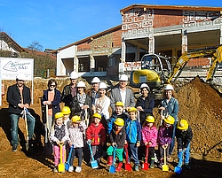 (ra) Mit Feuereifer und Begeisterung vollzogen die Kindergartenkinder mit Leiterin Silke Hien am Freitag den offiziellen Spatenstich zum An- und…