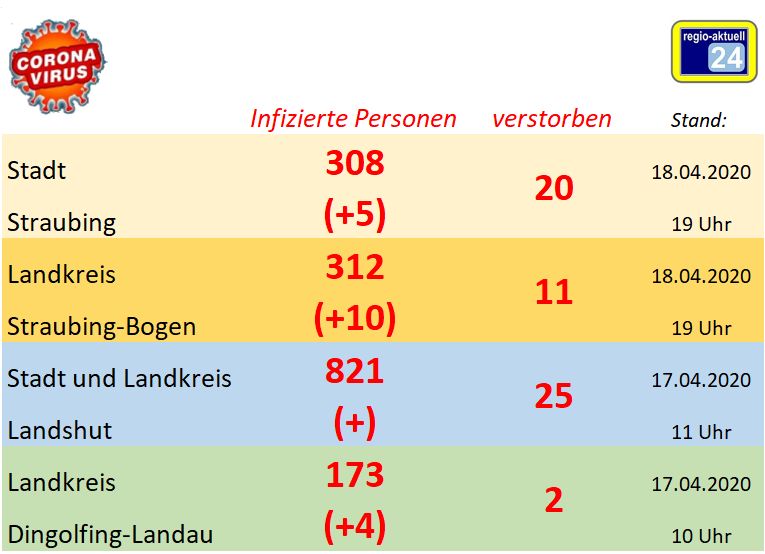 (pw) Wie ein Straubinger Rathaussprecher am frühen Samstagabend mitteilte, hat das Gesundheitsamts die 308. Person, die mit dem Corona-Virus infiziert ist, festgestellt. Vorsorglich auch der Hinweis, dass es sich dabei um die Zahl der insgesamt bisher festgestellten (!) Infektionen und nicht um die Zahl der aktuell infizierten Personen handelt. Im Landkreis Straubing-Bogen sind dies seit Ausbruch der Pandemie 312 (festgestellte) Infizierte.