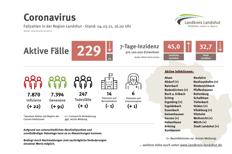 Das Robert-Koch-Institut meldete am Donnerstag (0 Uhr) für die Stadt Landshut mit 32,7 eine gesunkene 7-Tages-Inzidenz – der Wert, der die Neuinfektion in Relation zur Einwohnerzahl setzt, hat den ehemaligen „Frühwarnwert“ von 35 erstmals seit Ende Oktober 2020 wieder unterschritten. Im Landkreis Landshut ist dieser Wert mit aktuell 45,0 wieder etwas angestiegen. (Stand aller Angaben: 4. März 2021)