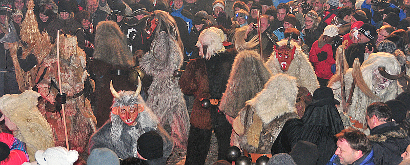 Die furchterregenden Gesellen im rauhen Pelzgewand, mit kunstvoll handgeschnitzten und -bemalten Masken tanzen um ein großes Lagerfeuer, um die Geister der Rauhnacht zu bannen. Sie scheppern mit Kuhglocken, schnalzen mit Peitschen, trommeln und lärmen auf vielfältige Weise. Bluadiger Damerl, Lucia und Haberngoaß sind nur einige der vielköpfigen Schar von Protagonisten, die zusammen mit der Musik für eine einzigartige Stimmung sorgen. Waldgeister mischen sich unters Publikum, der Bluadige Damerl haut mit dem Hammer, ein Unhold wird von der „Drud druckt“ und die Lucia geht mit der Sichel um…