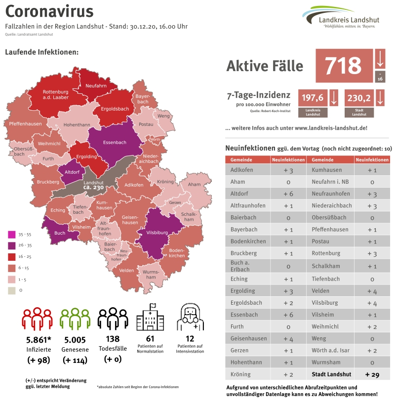 Die die 7-Tages-Inzidenz ist im Landkreis Landshut ist im Vergleich zum Vortag mit 197,6 erneut gesunken ist. In der Stadt Landshut ist die Wocheninzidenz mit aktuell 230,2 ebenfalls deutlich rückläufig (Quelle: Robert-Koch-Institut, 30.12.2020 um 0 Uhr).