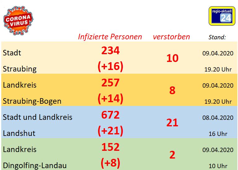 (ra) In der Stadt Straubing hat sich die Zahl der mit dem Corona-Virus infizierten Personen um 16 auf 234 Personen erhöht. Im Landkreis Straubing-Bogen lag die Zahl der Infizierten Personen am Donnerstagabend bei 257 Personen. Seit dem Bekanntwerden des ersten Corona-Falls in der Region starben ingesamt 18 Menschen, die mit Covid-19 infiziert waren.