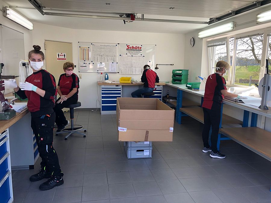 Die Mitarbeiter von Schütz Engineering bei der Produktion des Mund-Nasen-Schutzes. – Foto: Landratsamt Straubing-Bogen