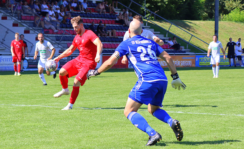 Die Holm-Elf legte hatte losgelegt wie die Feuerwehr. Florian Folger und Max Legler wirbelten die SV-Abwehrreihen gleich gehörig durcheinander. Einzig Gäste-Torwart Thomas Huber verhinderte mit zwei Glanzparaden einen frühen Rückstand. In der 15. Minute fand ein langer Flugball Florian Folger im Gästestrafraum und dieser wird von seinem Verteidiger klar umgerissen. Der fällige Elfmeterpfiff blieb aber aus.