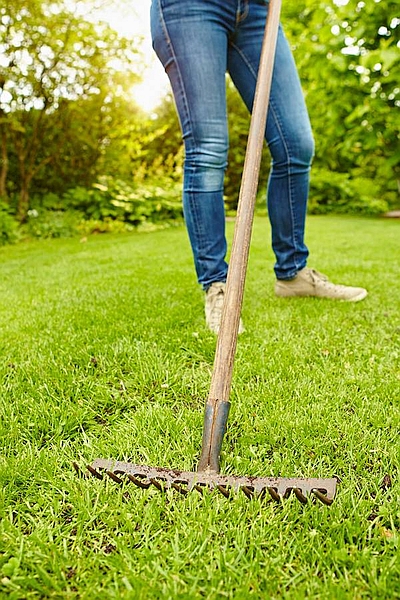 1. Zunächst die Rasenfläche mit einem Rechen von Laub und abgestorbenen, faulen Halmen befreien.
