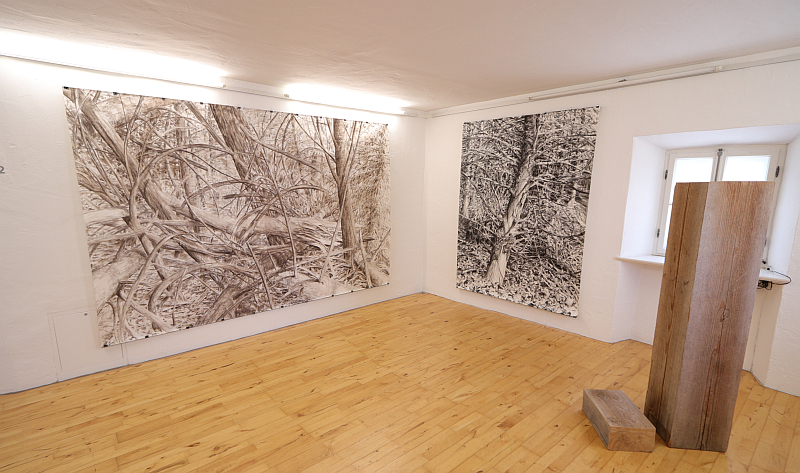 Thumbach arbeitet als Zeichner und Bildhauer im Holz und mit dem Holz, er spielt mit dem Material und zeigt dessen vielseitige Facetten. Mit seinen großformatigen Kohle-Zeichnungen nimmt Thumbach den Betrachter direkt mit in den Wald, und lässt einen die spontan eingefangene Situation mit Stämmen, Blättern und Unterholz quasi nach-erleben. Aber auch der tatsächliche Blick ins Holz selbst ist möglich: raffiniert und handwerklich höchst präzise ausgehöhlte Baumstämme laden als Skulpturen zum Hineinschauen ein, oder der Blick schweift meditativ über 285 Holz-Scheiben und folgt dem Verlauf der Jahresringe eines Baumstammes.