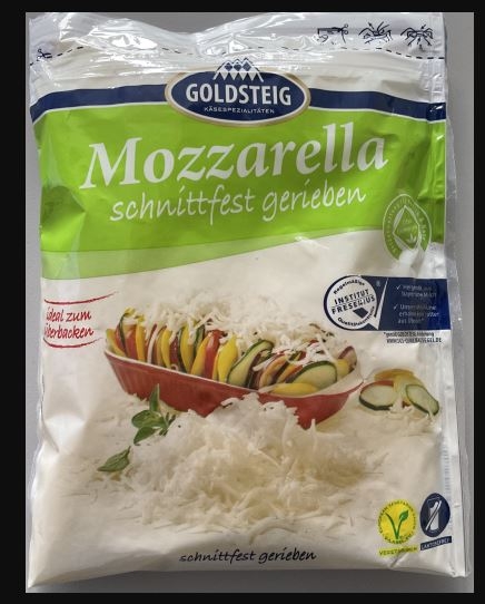 Auch der vom Hersteller mit dem Eigennamen vertriebene „Goldsteig Mozzarella schnittfest gerieben“ wird zurückgerufen. In einzelnen Packungen könnten sich demnach „kleine, weiße, gegebenenfalls scharfkantige Kunststoffstückchen“ befinden. Betroffen sind folgende Produkte, die bundesweit beispielsweise bei Rewe oder Metro erhältlich waren: