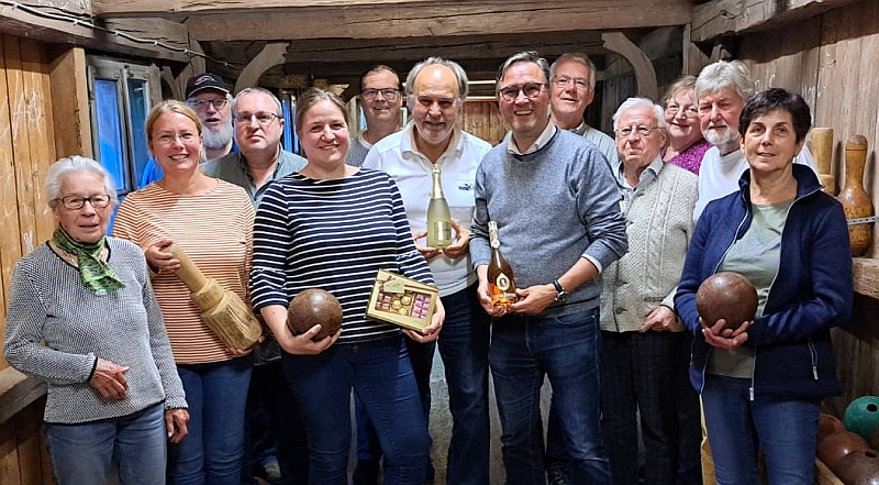 Wer mochte, konnte auch am lockeren Preiskegeln teilnehmen, bei dem Rosi Deser anschließend die kleinen Sachpreise überreichte. Jeweils eine Flasche Sekt an „den Besten“ Martin Panten und den Zweiten Erwin Gegenfurtner sowie Pralinen an die Dritte Silvia Diewald.
