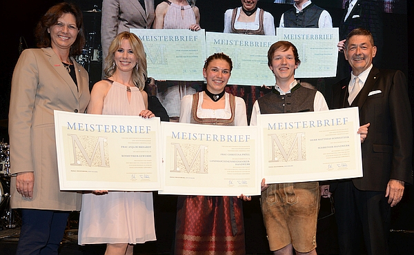 Warum der Meisterbrief ein Stück Zukunft für sie persönlich bedeutet, schilderten zwei Meisterinnen und ein Meister auf der Bühne. Mit dabei: die 30-jährige Kosmetikermeisterin Anja Burkhardt aus Regensburg. Sie ist seit sieben Jahren selbstständig und legte vor einem Jahr ihre Meisterprüfung ab. „In meinem Beruf trägt man dem Kunden gegenüber große Verantwortung, da gesundheitliche Aspekte unbedingt beachtet werden müssen.“ Dafür brauche man fundiertes Fachwissen. Der 23-jährige Schreinermeister Matthias Schweitzer aus Furth im Wald hat sich neben seinem Angestelltenverhältnis ein eigenes Geschäft aufgebaut: Über den klassischen Möbelbau hinaus hat er sich auf Gürtel mit Holzschnallen spezialisiert. Außerdem fertigt er Brillen nach Maß aus Holz, Stein und Heu an. Über seine Motivation zur Weiterbildung: „Ich will nicht auf der Stelle stehen, sondern mit der Technik gehen.“ Die 22-jährige Landmaschinenmechaniker-Meisterin Christina Pröll aus Eichstätt ist eine von zwei Frauen, die in diesem Beruf den Meisterbrief erhalten haben. Dass sie einen vermeintlichen „Männerberuf“ ergriffen hat, hat sie nach eigenen Angaben nie bereut. Ihr Anlass für die Meisterausbildung war nicht nur das Streben nach neuem Wissen: „Mir ist es wichtig, junge Menschen bei ihrer Ausbildung an die Hand zu nehmen.“ Staatsministerin Ilse Aigner überreichte den drei Absolventen den Meisterbrief, von Kammerpräsident Georg Haber erhielten sie den Meister-Pin zum Anstecken.