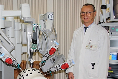 Der Gebärmutterschleimhaut-Krebs sei die häufigste bösartige Genitalerkrankung der Frau. Die meisten Frauen erkrankten zwischen dem 65. und 85. Lebensjahr daran. Hauptsymptom seien Blutungen in den Wechseljahren. Mit einer Ausschabung werde die Erkrankung abgeklärt. Als wichtigste Behandlungsmethode noch vor der Strahlen- und der Chemotherapie nannte Dr. Scholz die Operation: „Damit können wir die Frauen in der Regel heilen.“ Die Entwicklung gehe hierbei weg vom Bauchschnitt und insbesondere im Frühstadium hin zur Bauchspiegelung, um Gebärmutter, Eileiter und Eierstöcke zu entfernen. Seit vielen Jahren könne der Eingriff auch robotergestützt mit dem Da-Vinci-Operationssystem durchgeführt werden.