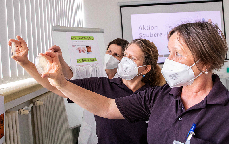 Organisiert hatte die Veranstaltung die Abteilung Klinikhygiene. „Wir wissen, wie wichtig es ist, auch alltägliche Tätigkeiten wie die Händedesinfektion regelmäßig zu schulen“, so Dr. Peter Kaiser, Leiter der Klinikhygiene. Eine konsequente Händedesinfektion schützt Patienten und Kollegen und dient auch dem Eigenschutz: „Für die Händedesinfektion gibt es keine Kompromisse“, betont der Hygieneexperte. Denn die Hände sind der Krankheitsüberträger Nr. 1, beispielsweise bei Grippe-, Noro- und natürlich Covid-19-Viren. Händewaschen mit Wasser und Seife ist im medizinischen Umfeld keine Alternative: „Auch nach dem Händewaschen verbleiben manche Erreger auf der Haut“, so Dr. Kaiser.