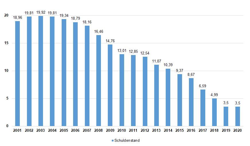 Der Schuldenstand hatte sich im Vorjahr von 4,99 auf 4,5 Millionen gesenkt. Der aktuelle Haushalt sieht vor, dass dieser Schuldenstand auch 2020 auf diesem Niveau bleiben wird.