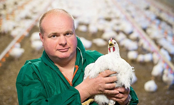 Der Geflügelmäster im westfälischen Hörstel versorgt auf seinem Hof gemeinsam mit seiner Familie rund 79.000 Hühner, die jeweils sechs Wochen lang gemästet werden. Dabei muss er besonders sorgfältig sein, denn Hühner sind sehr empfindliche Tiere: „Von der Stalltemperatur und Lüftung über die Futtermittel und Tränkebahn bis hin zur Einstreu muss alles stimmen“, betont Rohlmann.