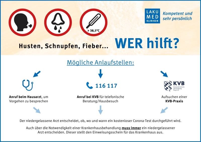 „Bitte wenden Sie sich bei Husten, Schnupfen, Halsschmerzen und leichtem Fieber telefonisch an Ihren Hausarzt, um das weitere Vorgehen zu besprechen“, sagt Jakob Fuchs, geschäftsführender Vorstandsvorsitzender der LAKUMED Kliniken. „Zusätzlich ist der Ärztliche Bereitschaftsdienst der Kassenärztlichen Vereinigung Bayern rund um die Uhr unter der Telefonnummer 116 117 erreichbar, um Patienten telefonisch zu beraten und Hausbesuche durchzuführen“, ergänzt André Naumann, Interimsgeschäftsführer des Klinikums Landshut. „Bei Erkältungssymptomen kann auch außerhalb der üblichen Hausarzt-Öffnungszeiten die Bereitschaftspraxis der KVB am Klinikum Landshut oder am Krankenhaus Landshut-Achdorf aufgesucht werden“, so Prof. Dr. Florian Löhe, ebenfalls Interimsgeschäftsführer am Klinikum. „Seit Oktober 2020 bietet auch das Kinderkrankenhaus St. Marien an Wochenenden und Feiertagen eine Bereitschaftspraxis der KVB an. Diese ist ausschließlich von Kinderärzten besetzt“, so Bernhard Brand, Geschäftsführer des Kinderkrankenhauses St. Marien.