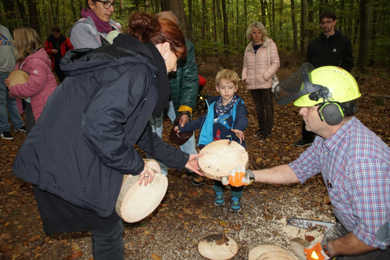 Nach dem Ausasten sägte Köglmeier für jeden eine Baumscheibe vom Stamm. Und ein etwa 60 Zentimeter langes Stammstück schleppten die Besucher mit zum Walderlebniszentrum. Dort fragte der Forstwirtschaftsmeister, welche Tiere sich im Wald verstecken. Und dann zauberte er aus dem Stamm mit der Motorsäge ein Eichhörnchen.
