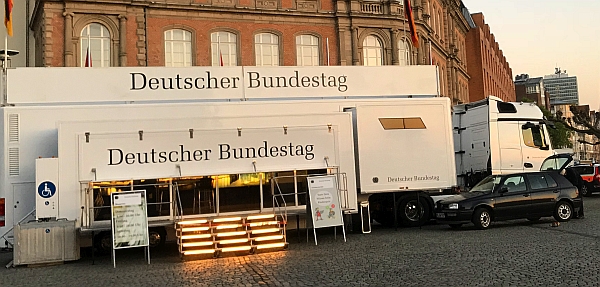 Das weiße Infomobil des Bundestages ist 16 Meter lang, 25 Tonnen schwer und ein rollender Bürgertreff. Die Besucher werden von Mitarbeitern des Bundestages betreut. Sie können sich unter anderem an Computerterminals unkompliziert über Politiker, politische Institutionen und Ämter informieren. Für Kinder gibt es altersgerechte Angebote mit der Comicfigur Karlchen Adler und einem Glücksrad.