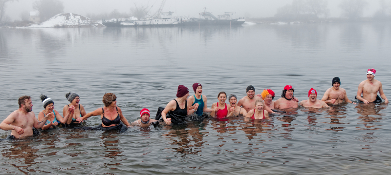 Am Ziel angekommen wurden die Teilnehmer mit warmen Getränken und Applaus empfangen. Ein Teil der Gruppe ließ es sich am Schluss nicht nehmen noch Oberkörperfrei in die Fluten zu tauchen um sich „Abzukühlen“.